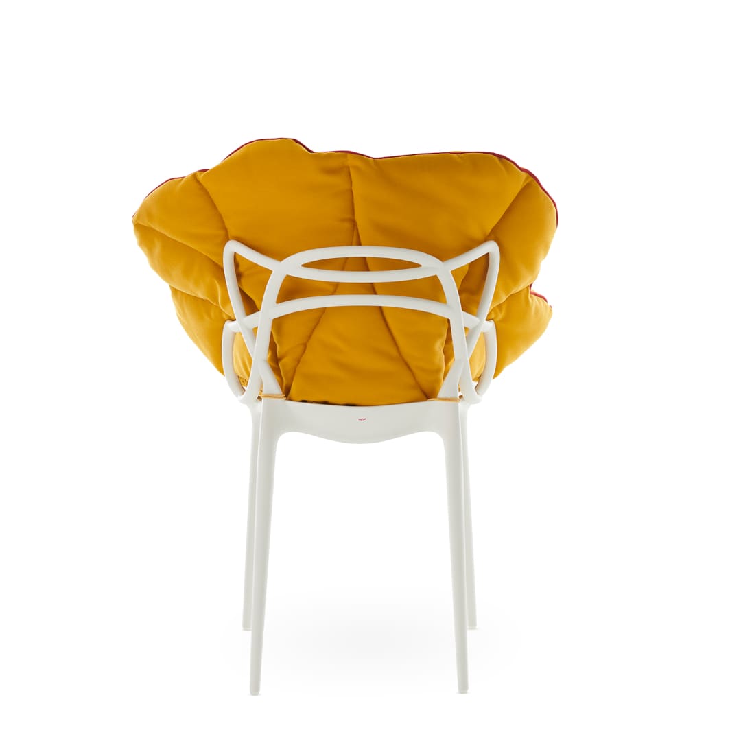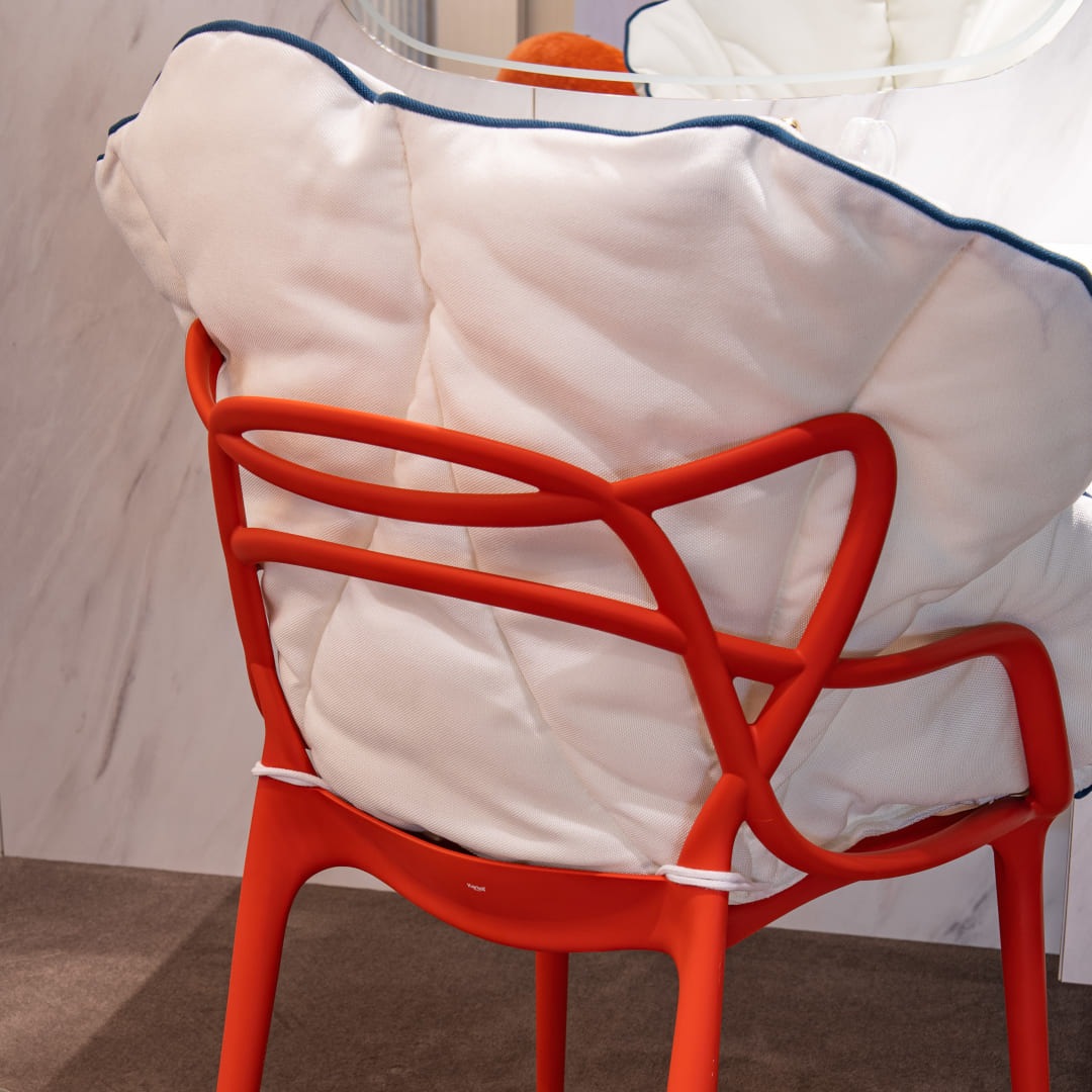 Kartellのアイコンであるポリカーボネート製チェアなどにこのクッションを合わせることで、ゆったりとくつろげるソフトなアームチェアのような使い心地にアップデートできます。