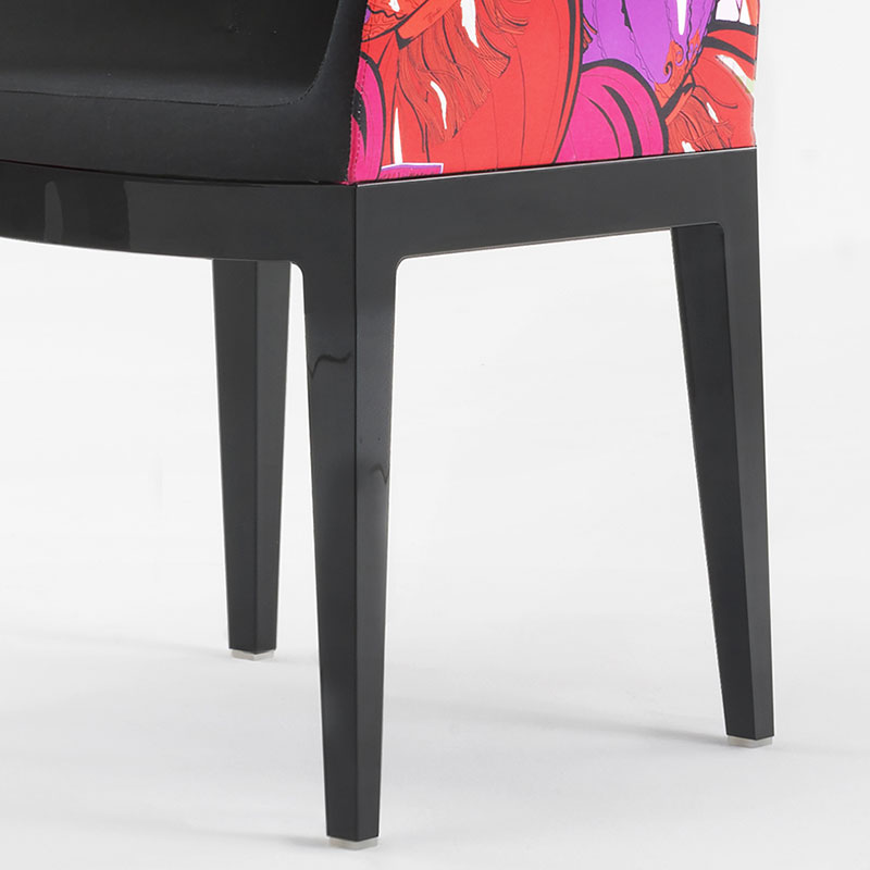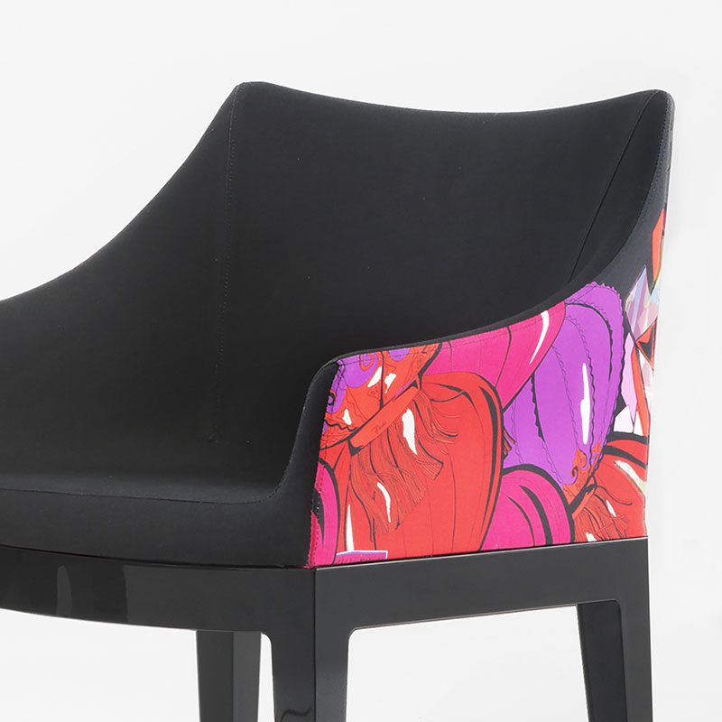 フィリップ・スタルクがカルテルのためにデザインした布張りのアームチェア「マダム」は、削ぎ落とされ洗練された直線の中のアームの曲線がモダンで美しいフォルムを実現しています。そこにエミリオ・プッチの代名詞ともいえる大胆なプリントが加わることで、アート作品のように見る者を楽しませてくれます。ブラックの脚はアートワークを強調し引き締まった印象、クリアの脚は宙に浮くような軽やかな印象を感じさせます。