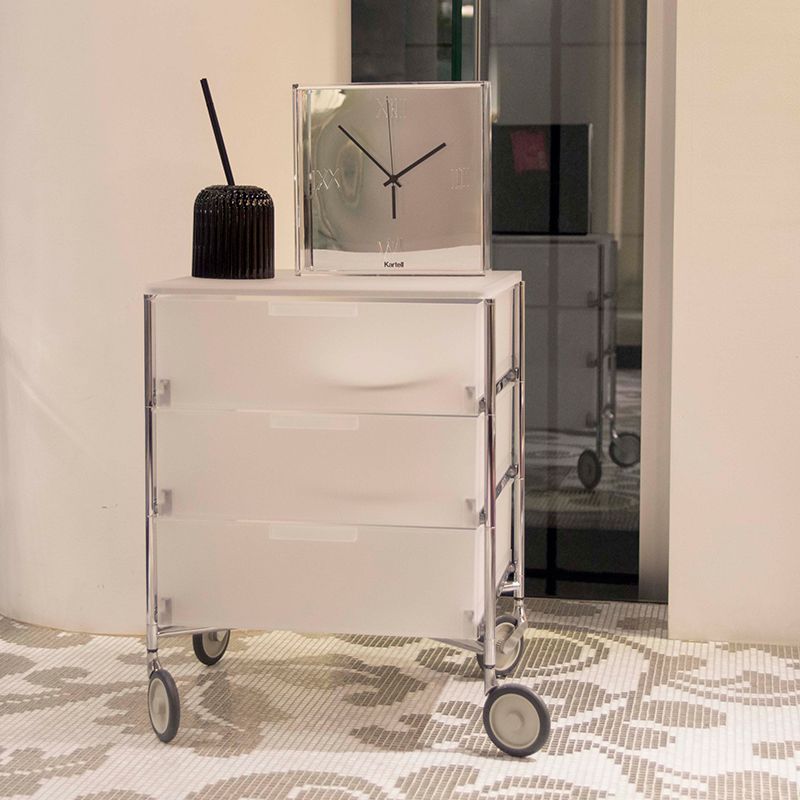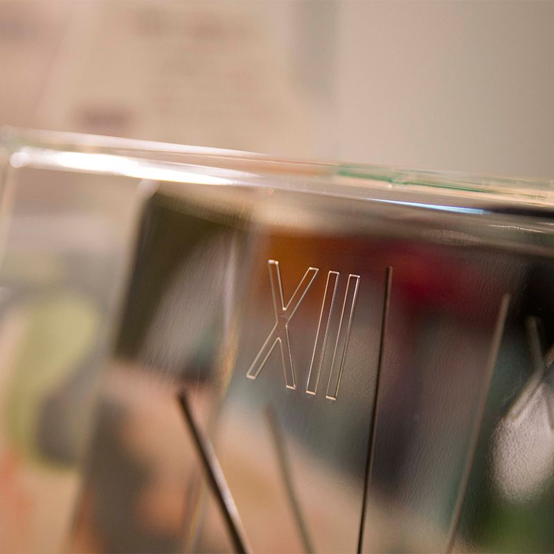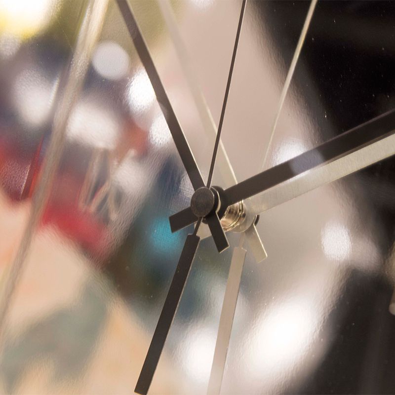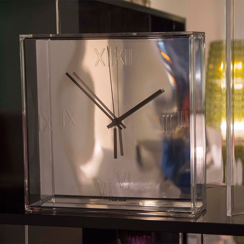 30×30cmの四角い透明の「箱」の形をしており、文字盤は平たくて、ローマ字が刻まれています。文字盤の時計・分針の鮮やかなカラーのコンビネーションにより、時計という実用品が美しいオブジェに変身しました。ティックタックは奥行きの深い時計で。光と投影が面白い視覚効果をつくりだします。