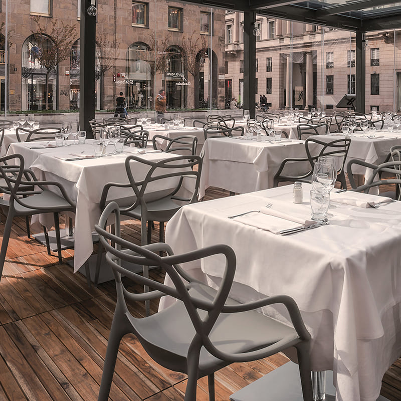 ヨーロッパのカフェは大抵、オープンエアなお店の前の路地に広がっています。そんな場所にも樹脂の一体成型のマスターズはぴったりです。木製、金属、レザーやファブリックのように気を使うこと無く、少々の雨風に耐えることができます。 これは同時に清掃のしやすさにも結びついています。小さなお子様やペットのいるお家にもオススメです。
