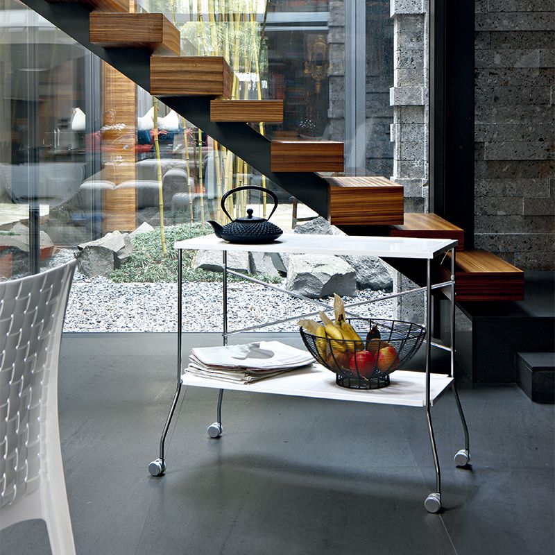 Kartellのコレクションに新しい折りたたみワゴンが仲間入りしました。PMMA樹脂製のトレイと金属のフレームの見事なコンビネーションをシンプルで洗練されたデザインで仕上げました。例えば前菜やビュッフェを運ぶ為のワゴンとしても、トレイ部分を取り外して使えるコーヒーテーブルとしても、幅広く活躍します。折りたたんで小さく収納することもできます。