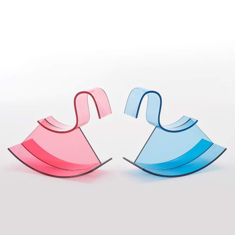 「nendo」デザインの透明ロッキングホース。高層ビルや橋に使用するH 型鋼柱の、少ない材料で高い強度が得られるH 型ビームの効率の良さに気づき、H 型ビームで幼児向けの遊具を作ってみようと考えたことで生まれました。