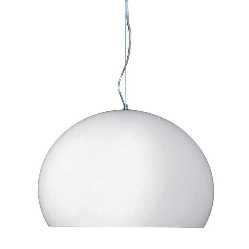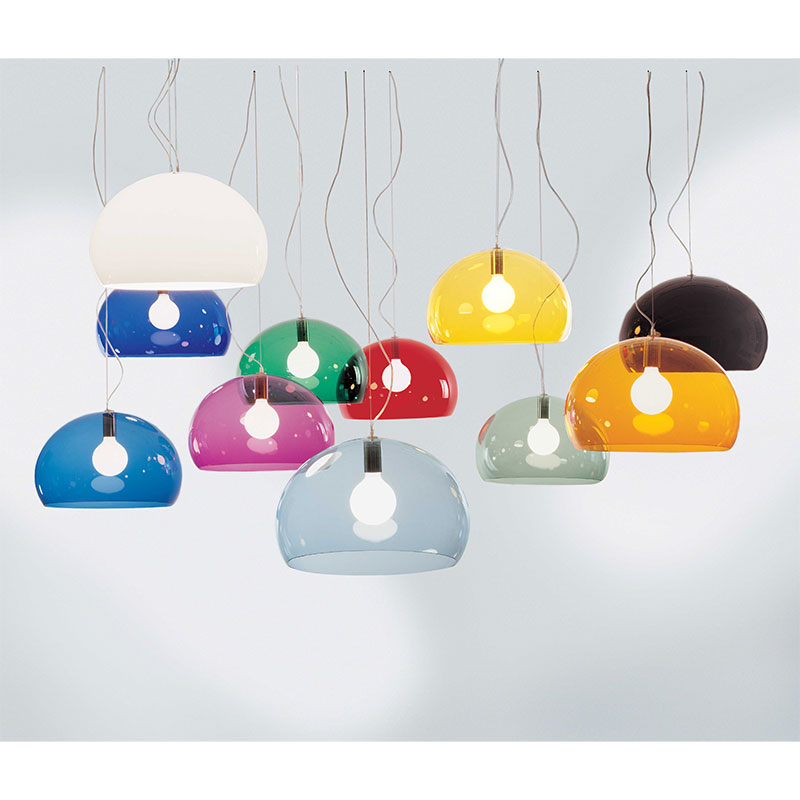 シンプルですが、ちょっとしたデザインの工夫でひときわ美しいランプです。アクリル樹脂のシェードは、半球をわずかに長くした形で光を包み込みます。素材が放つ光彩は、輝くシャボン玉を思わせます。多色を組み合わせて吊ると、いっそう楽しい雰囲気が演出できます。フェルーチョ・ラヴィアーニ、デザイン。