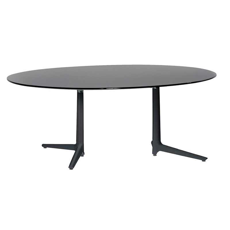大きさは大型のオーバル、レクタングルの158と180、237センチの3サイズ、丸型120と80センチ、正方形の100と80センチの8サイズ、重厚なトップを支えるため、脚はアルミのダイキャスト製で、スポークベースとラウンドベースからデザインを選ぶことが可能です。