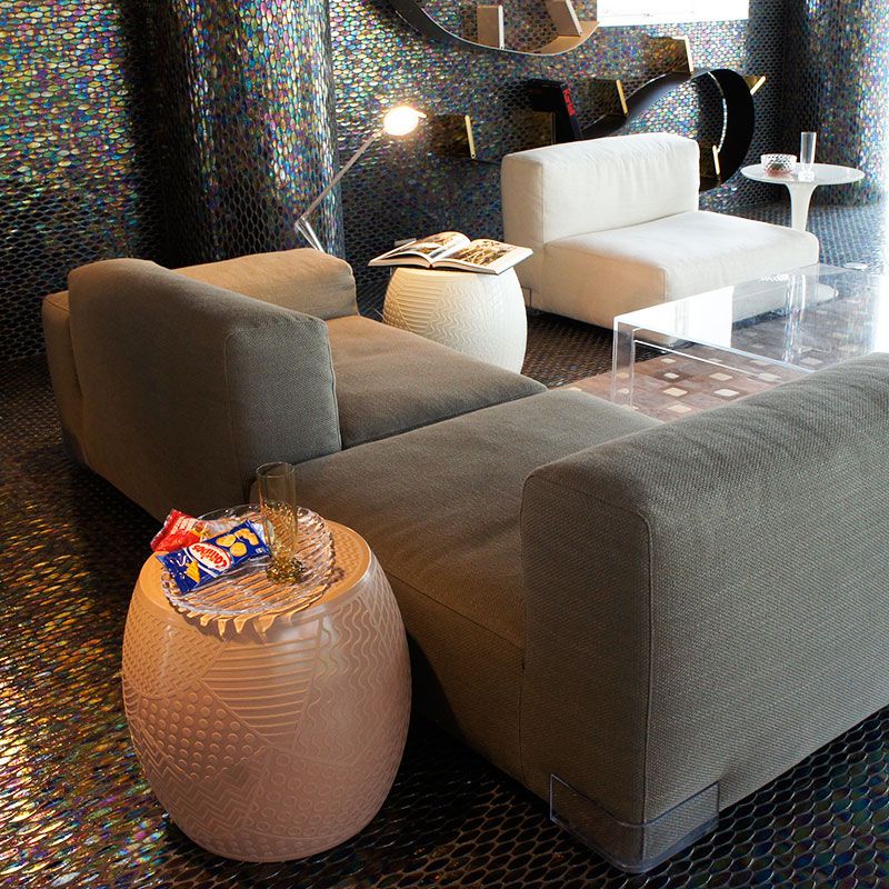 古くからある典型的な樽型のチャイニーズスツールの形に、ロイ・リキテンシュタインを連想させるアメリカンポップアートのグラフィックパターン、最も異なる要素をひとつにしたミックススタイルです。