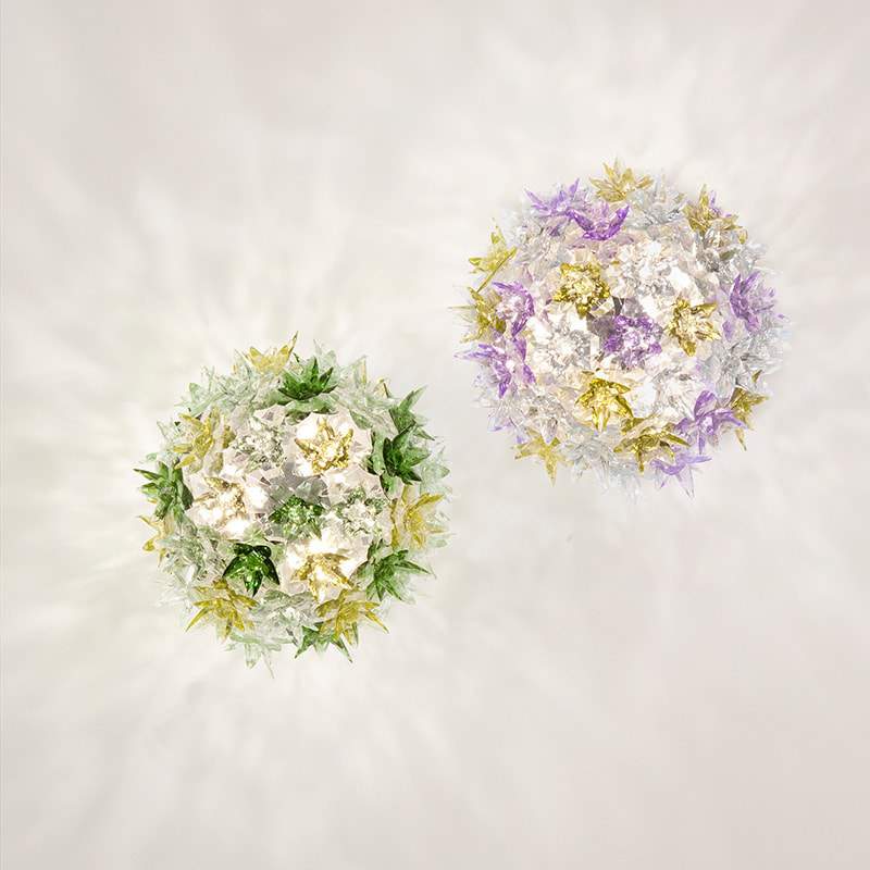 楕円型のフレームを光輝く花のモチーフで覆ったブルームランプシリーズはカラー・サイズ、さまざまなタイプで展開します。花型のオーナメントを通して光が複雑に屈折し、数え切れないほどの輝きを放ちます。