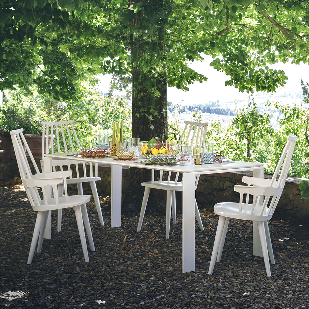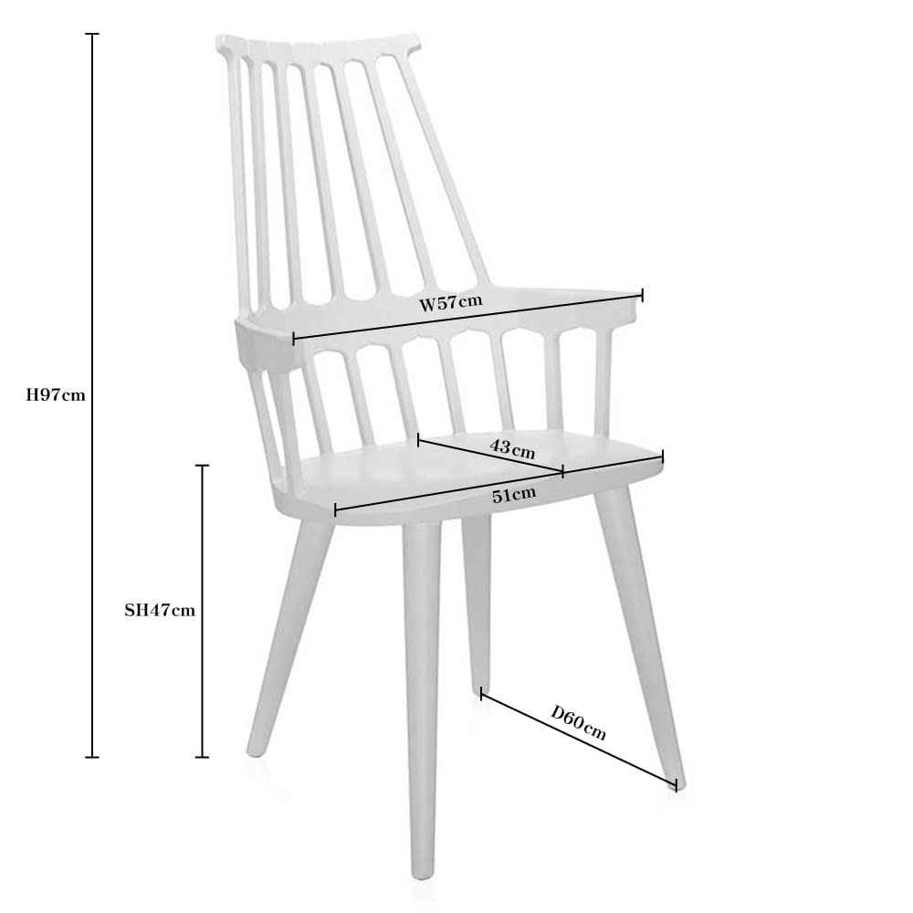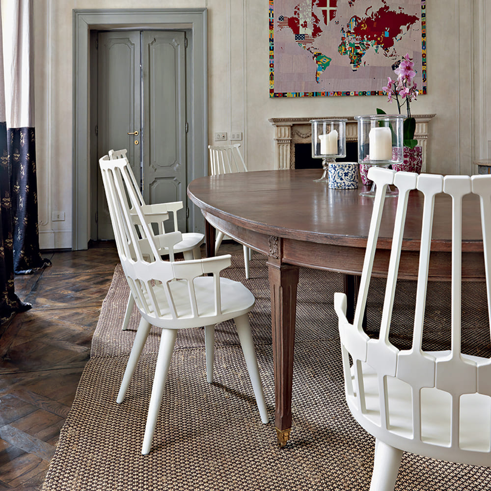 ウィンザーチェアとして知られる英国クラシックスタイルのデザインが、先端の樹脂成型技術を使ったニュールックの椅子として現代にカムバック。櫛状の背部(COMB BACK)の支柱と繋がる、六角形の補強リムが腰にフィットし、人間工学的にもおさまりのよいサイズ感の椅子に生まれ変わりました。