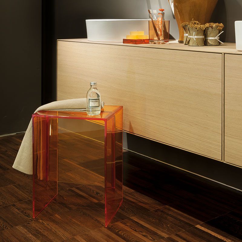 1枚板を組み合わせたようなこのスツールは、透明なプラスチックでできています。頑丈さが強調されているように充分な厚みを感じさせるデザイン、そしてサイズ感も抜群で、実用的で多目的な用途でさまざまなシーンに対応します。