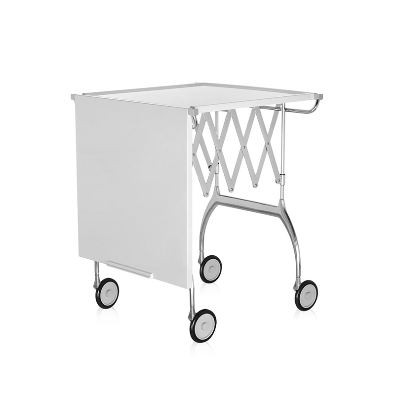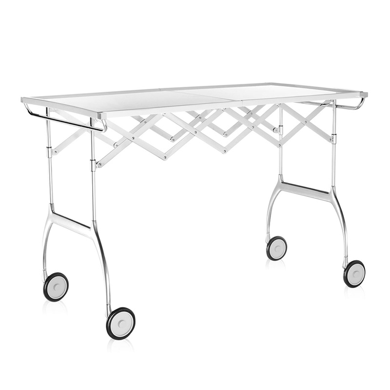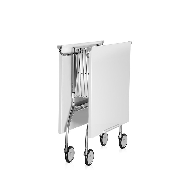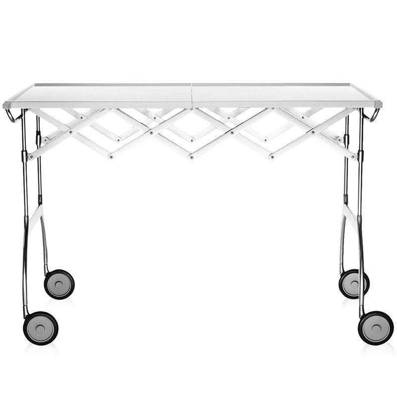 単なるダイニングカートではありません。プラスチック素材と金属の絶妙なコンビネーションの美しさもさておき、フォールディング式で自在に長さが変えられるので、ビュッフェやワインクーラー用のサイドテーブルとしてなど多種多様に活躍します。
