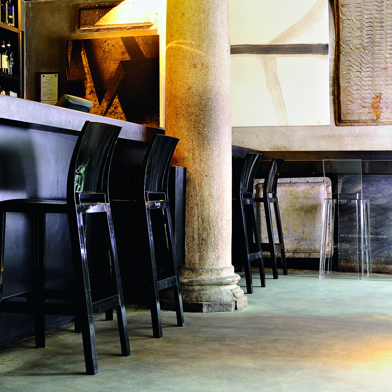 ゆったり落ち着ける快適なハイスツール。きちんとした背もたれがあるので、身体を預けてついつい「もう一杯(ワンモア)」と呟いてしまうかも知れません。カルテルのアイコンであるゴーストシリーズのファミリーです。