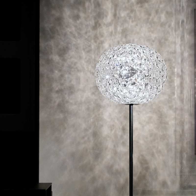 光の屈折を緻密に計算したシェードの加工とカルテルが独自に開発した内蔵のLED照明によりクリスタルガラスの輝きをプラスティックで実現しています。