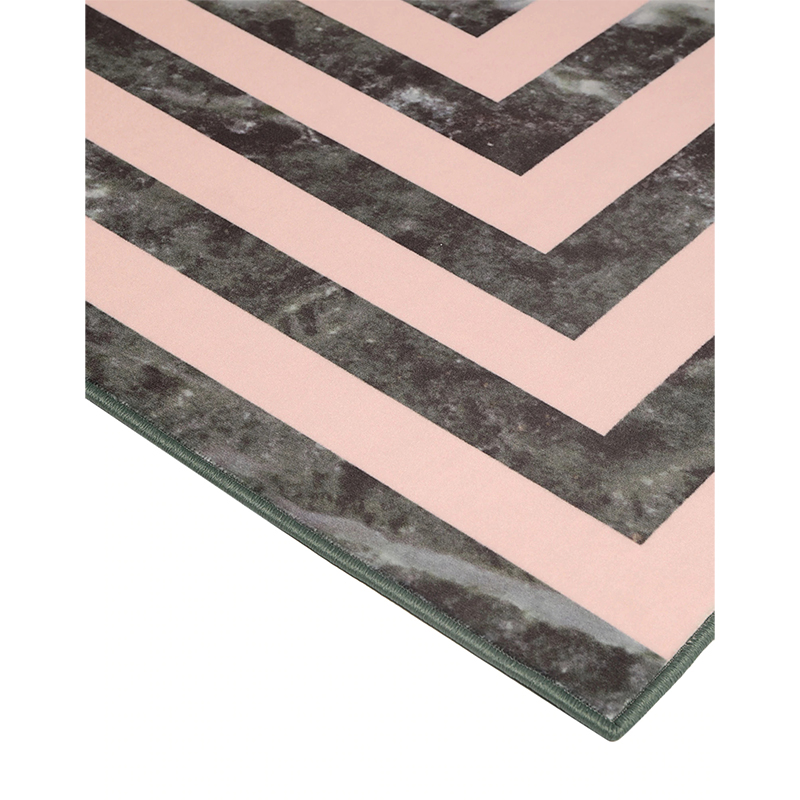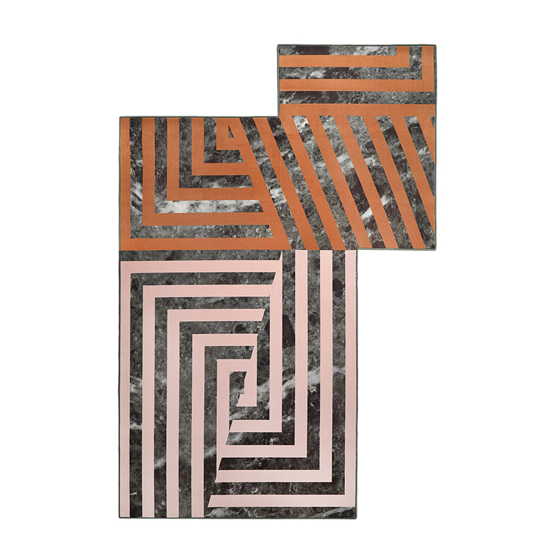 デジタルプリントの技術を活かして、リアルな大理石柄が再現されており、パステル調のなんとも言えない中間色を多用した幾何学パターンとの、性質の全く違うユニークな組み合わせです。