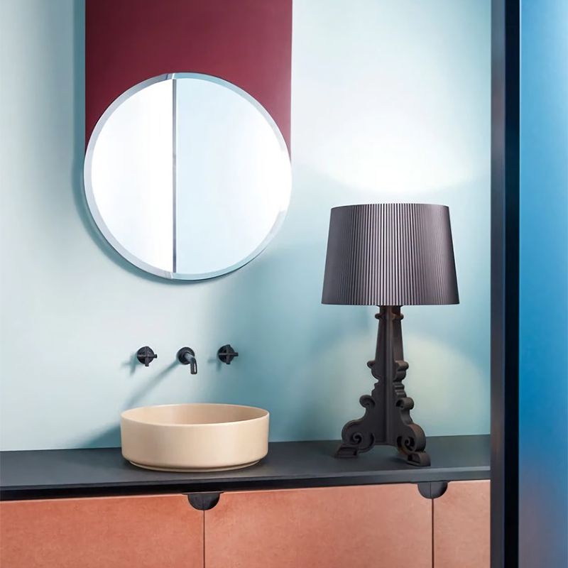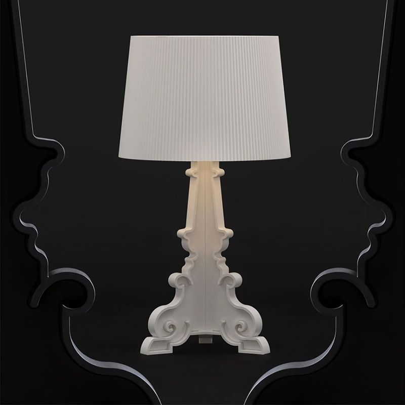 Bourgieは、まさにKartellスタイルの集結。バロック調モチーフの3枚のベースがフレームを構成します。シェードは大きめでプリーツ装飾があり、点灯すると神秘的な光を放ちます。個性的でありながら様々な環境にフレキシブルに順応するので、応接間のサイドテーブルに載せてもよし、ベッドサイドにムードある光を添えるもよし、さらに読書用ランプとしても最適です。セードは3段階の高さに調節が可能です。