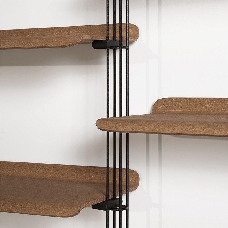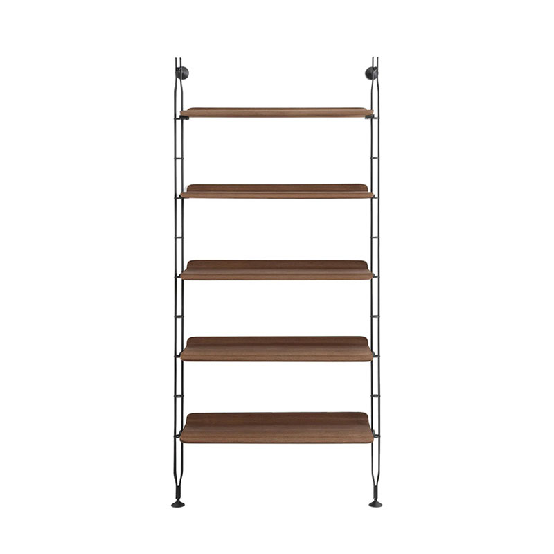 棚板を両側で支える支柱は、1本のみで、床と背中側の壁面に荷重を分散します。ブラックカラーに統一された細く華奢な金属フレームが、シンプルさをより強調しています。