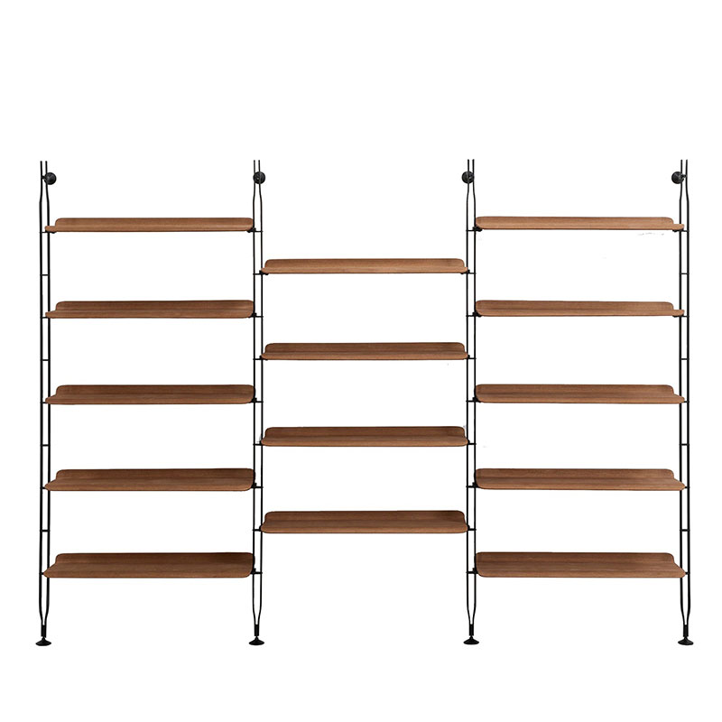 棚板を両側で支える支柱は、1本のみで、床と背中側の壁面に荷重を分散します。ブラックカラーに統一された細く華奢な金属フレームが、シンプルさをより強調しています。