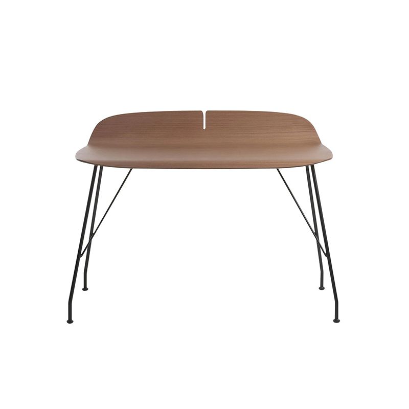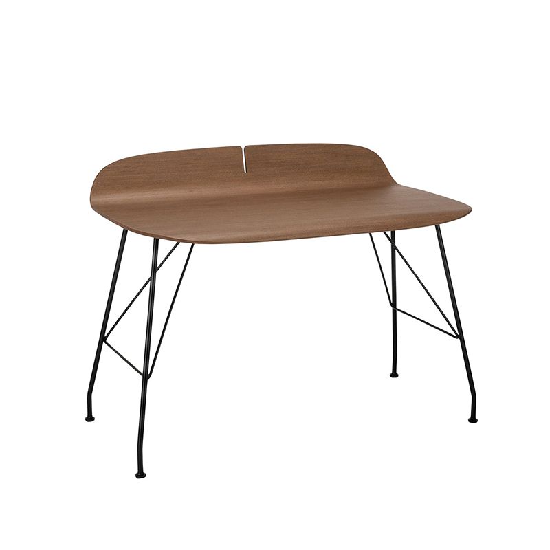 木の美しいカーブが特徴のシンプルなデスクです。奥と手前のエッジがカーブし、中央にはアクセントの切込みがあり、スタイリッシュな佇まいです。