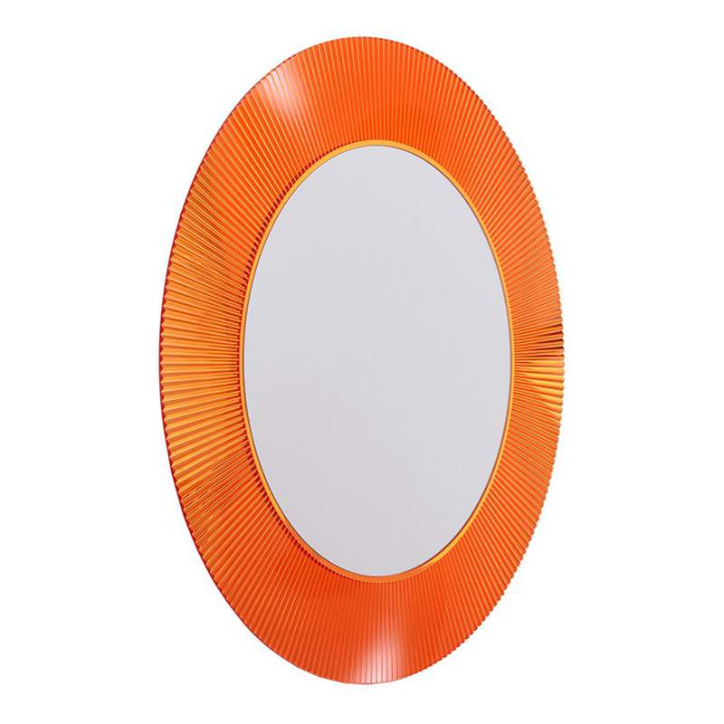 ラウンドしたプリーツ状のフレームは光の反射を意識したデザイン。これは、カルテルが生んだアイコニックな照明ブルジーを思い起こす、紛れもないバロック調の華麗なスタイル。人の姿を映し出す鏡としてだけでなく、インテリアとして光の効力を考えてつくられました。