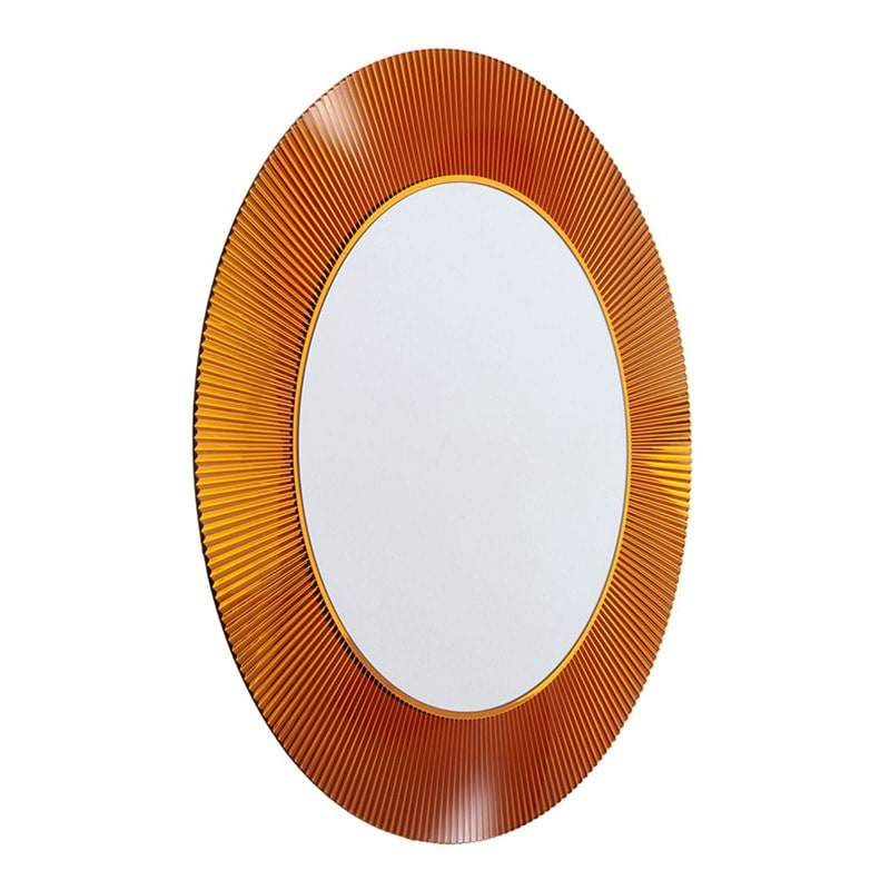 ラウンドしたプリーツ状のフレームは光の反射を意識したデザイン。これは、カルテルが生んだアイコニックな照明ブルジーを思い起こす、紛れもないバロック調の華麗なスタイル。人の姿を映し出す鏡としてだけでなく、インテリアとして光の効力を考えてつくられました。