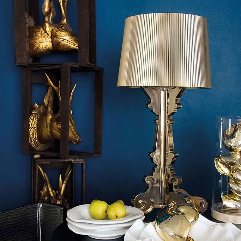 Bourgieは、まさにKartellスタイルの集結。バロック調モチーフの3枚のベースがフレームを構成します。シェードは大きめでプリーツ装飾があり、点灯すると神秘的な光を放ちます。個性的でありながら様々な環境にフレキシブルに順応するので、応接間のサイドテーブルに載せてもよし、ベッドサイドにムードある光を添えるもよし、さらに読書用ランプとしても最適です。セードは3段階の高さに調節が可能です。
