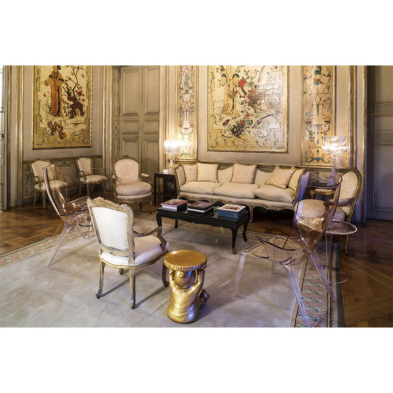 フィリップ・スタルクによる、一体成型透明ポリカーボネート製の革新的チェア、アンクルジムは、曲線美が非常に魅力的なチェアで屋内、屋外を問わずさまざまなインテリアのニーズに対応します。