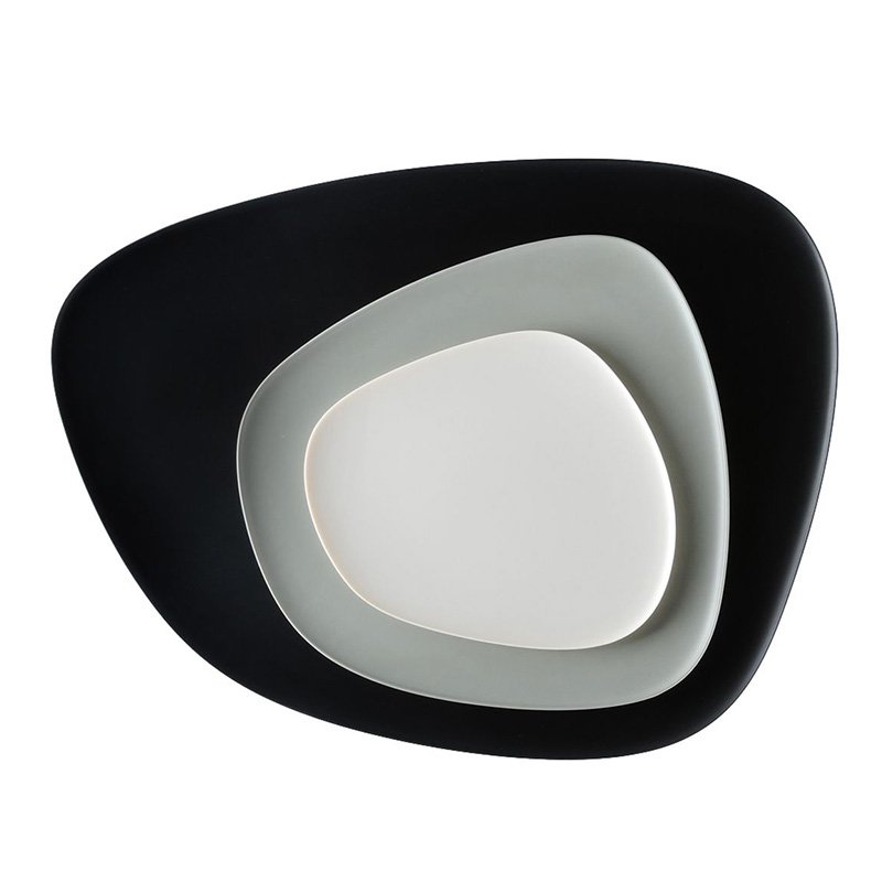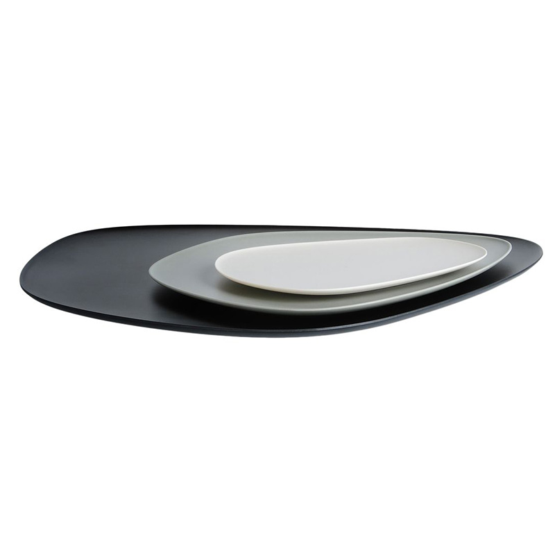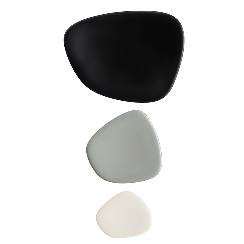 サイズの異なるディッシュ/トレイの3点セット「ナマステ」は、有機的でアシンメトリックなデザインが特徴です。平たい石を思わせるような形で、色使いは極めてナチュラルです。