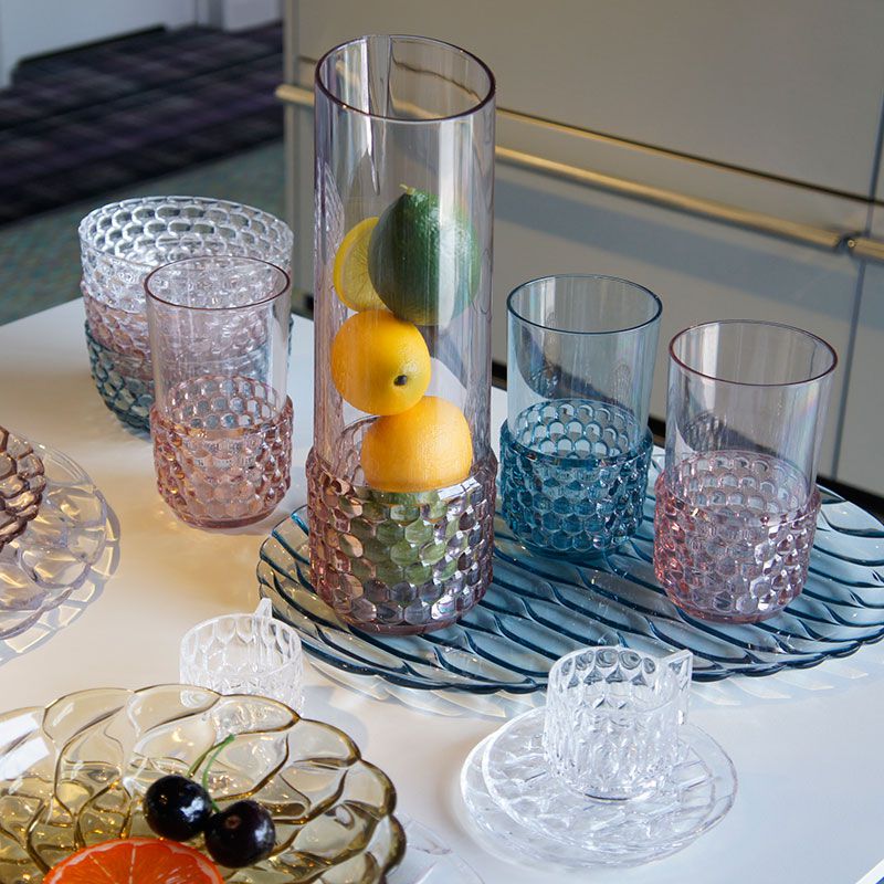 クリスタルガラスやダイヤモンドは、カッティングによって輝きや印象が変わります。このジェリーズも、表面のテクスチャ―デザインへのあくなき研究によって、今までのプラスチック製の食器では考えられなかった、驚きの美しさを実現させました。