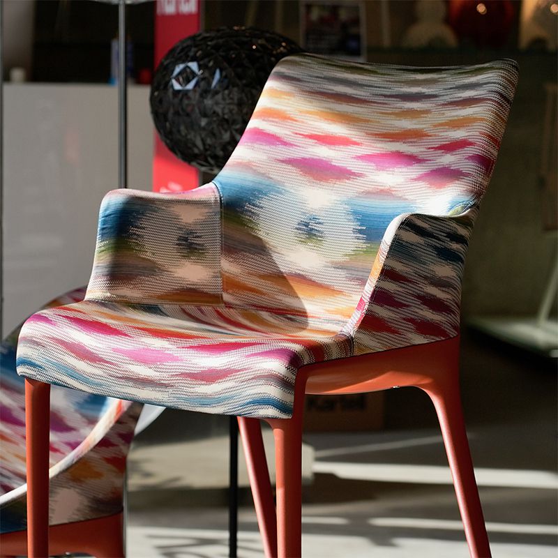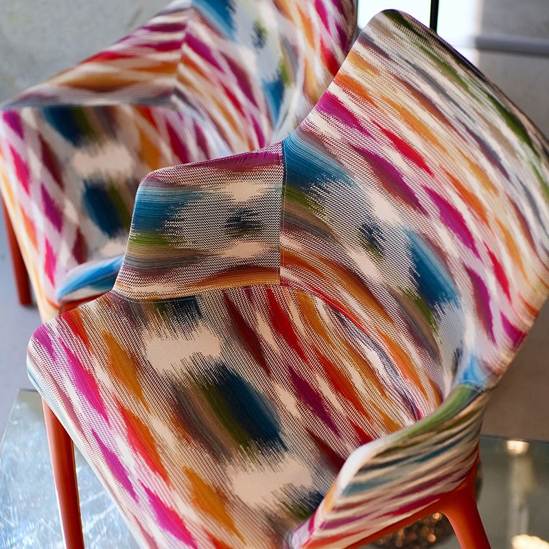 エレガンツァミッソーニの巧みなファブリック使いは、ミッソーニのブランドの美意識に通じるもので、このアームチェアの魅力でもある柔らかでなめらかなフォルムを際立たせるためジャカードが使われています。