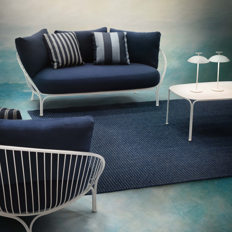 「クレオ|Kleo」は屋外での使用にも適した素材のラグシリーズ。2m丸形、2×2mの正方形、2.4×2mの長方形の3種のサイズ展開です。