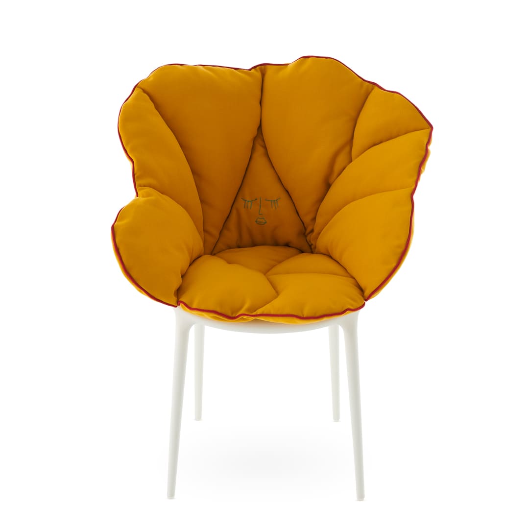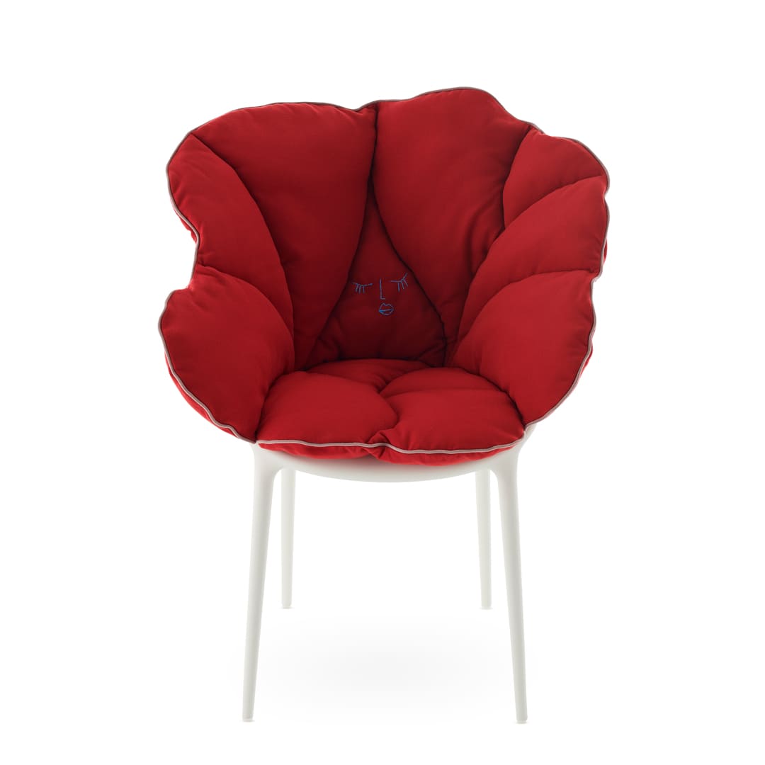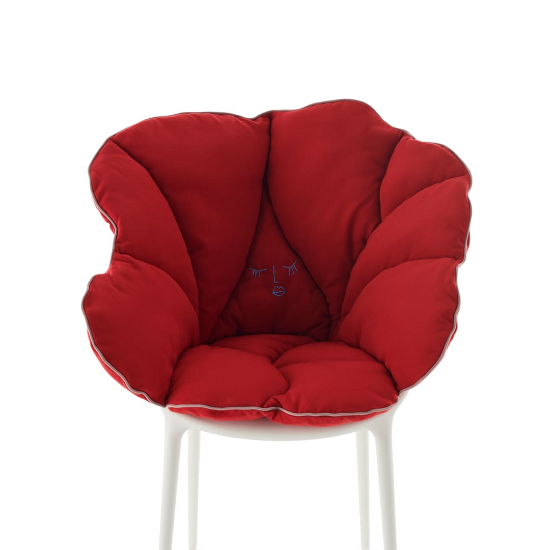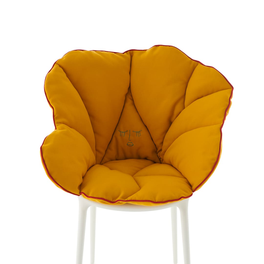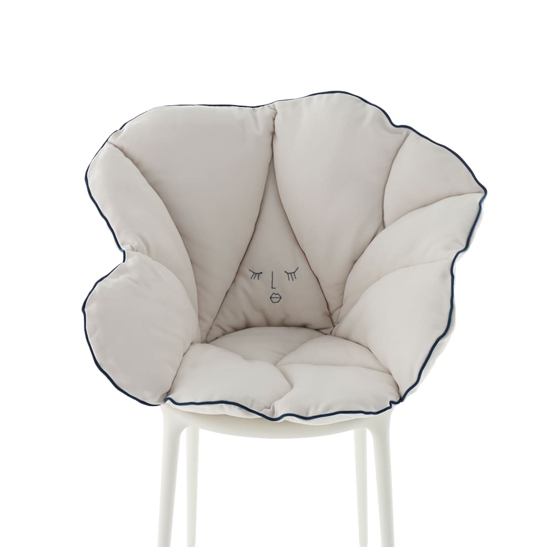 Kartellの象徴的なチェアに重ねるだけで、花びらが包み込むような柔らかさが加わり、軽やかな素材美と快適性が共存する新しい座り心地を生み出します。