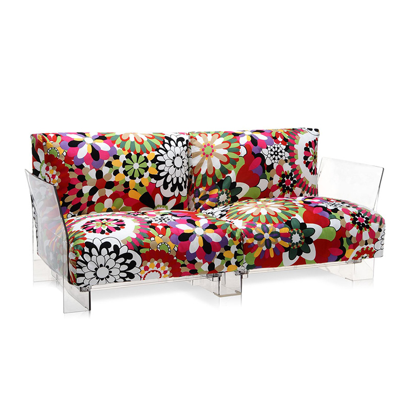 カルテルを代表するソフトファニチャー達が、ソットサスが率いたメンフィスコレクションのファブリックに包まれて登場。